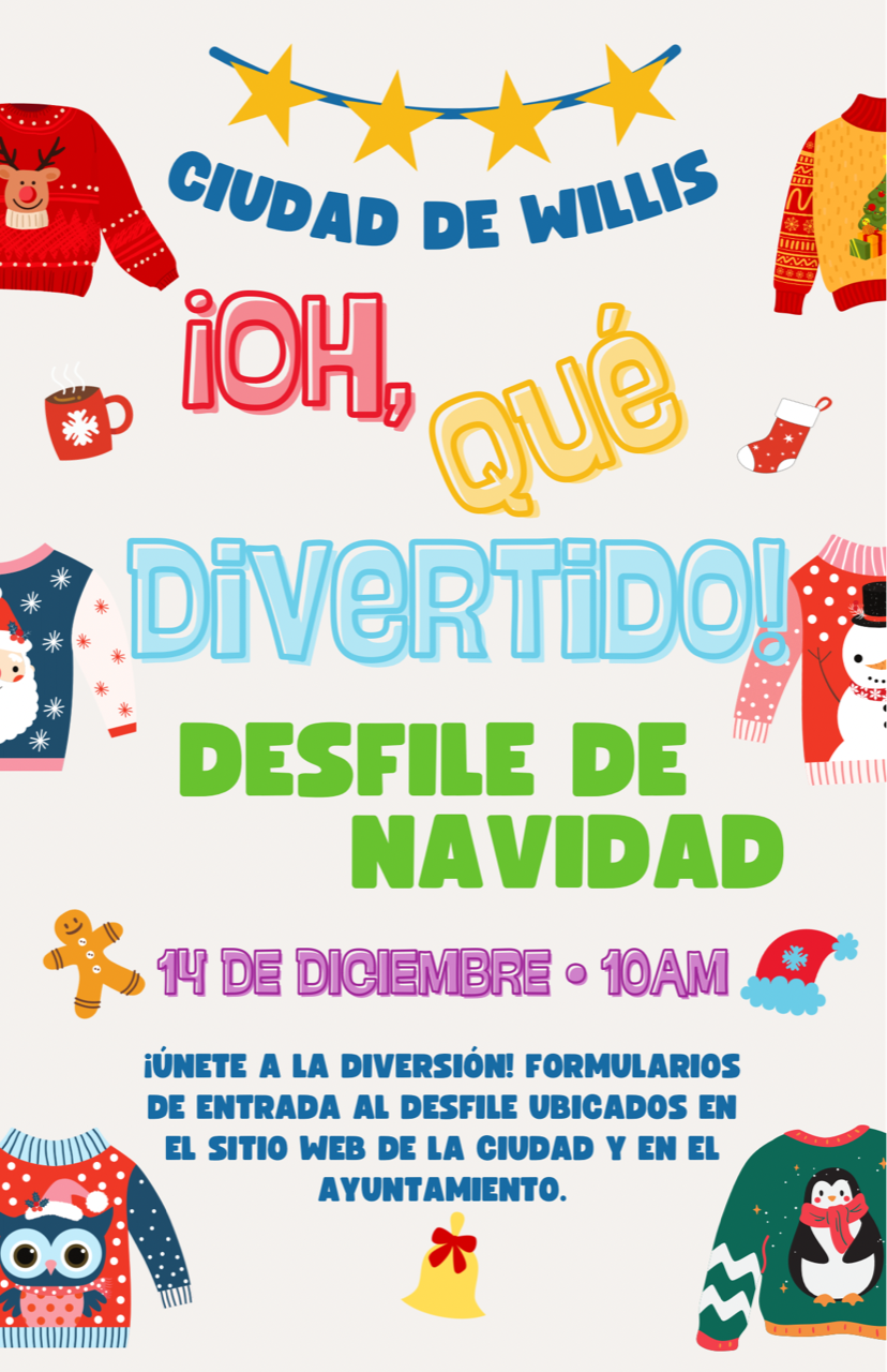 BY MAIL: Willis Christmas Parade, PO Box 498, Willis TX 77378